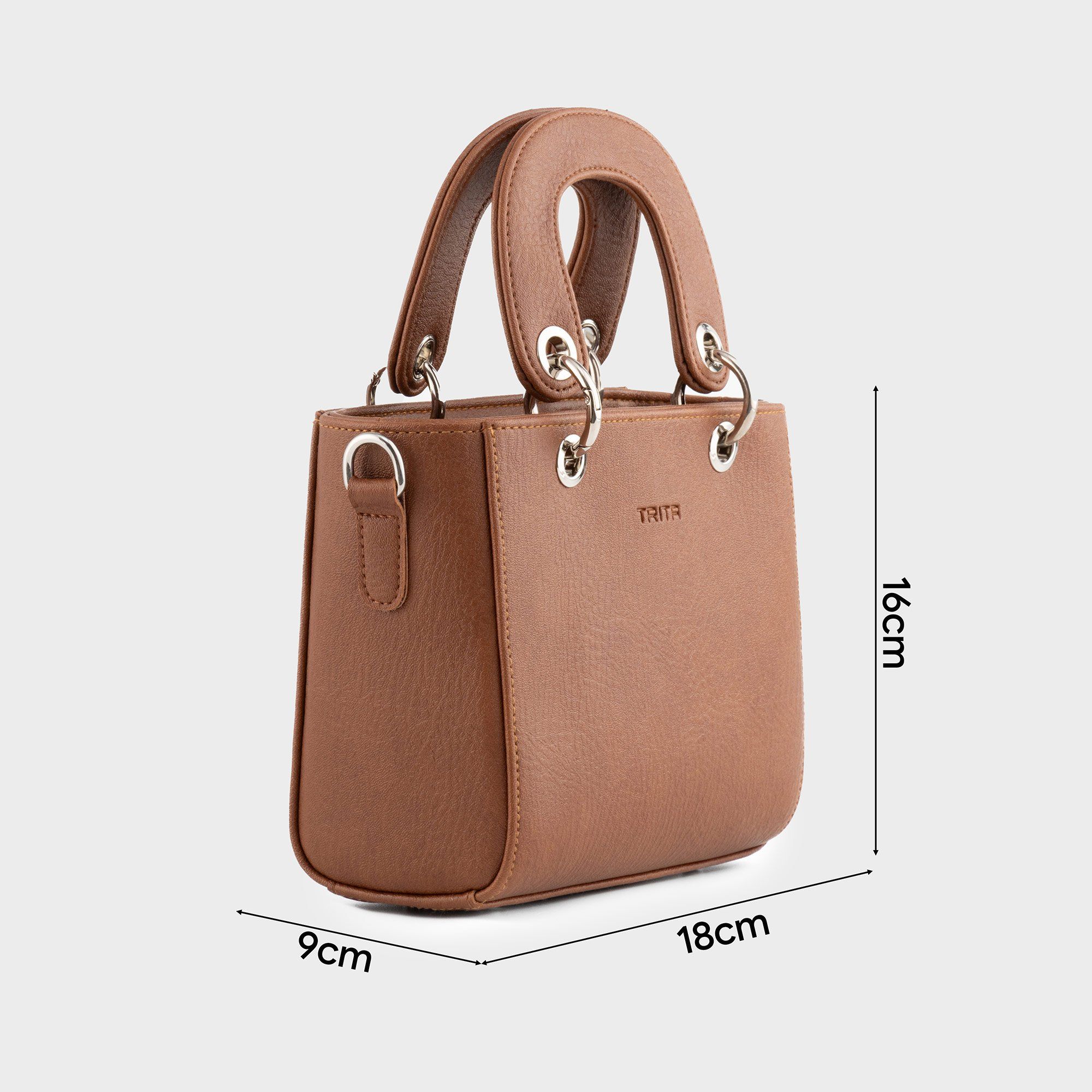 Túi xách da nữ quai cầm cách điệu Trita RTX24 có thiết kế form hộp vuông basic kèm quai cầm bản to cực kỳ ấn tượng. Đặc biệt với chất liệu da tổng hợp cao cấp chống thấm nước và có độ bền cao không chỉ giúp tăng tuổi đời mà còn tăng giá trị thẩm mỹ của sản phẩm. Hơn nữa, 3 màu sắc cơ bản của sản phẩm đen, nâu, bò đều rất sang trọng và rất dễ phối đồ, hoàn toàn phù hợp khi sử dụng để đi làm đi chơi, đi cà phê đi dạo phố,...